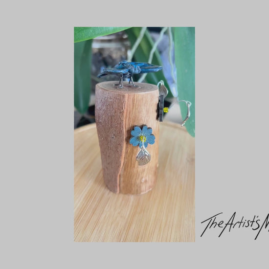 Hand made with timber and metal charm details. Ontop sits a gorgeous polymer clay handmade shimmery blue dragonfly with little diamanté eyes.
