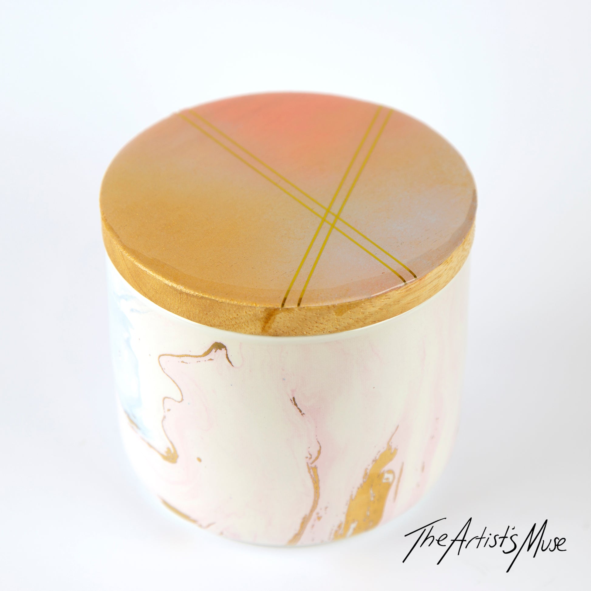 The lid of this jar has been hand painted, detailed with gold striping tape and finished off with clear resin giving a beautiful glass like finish.