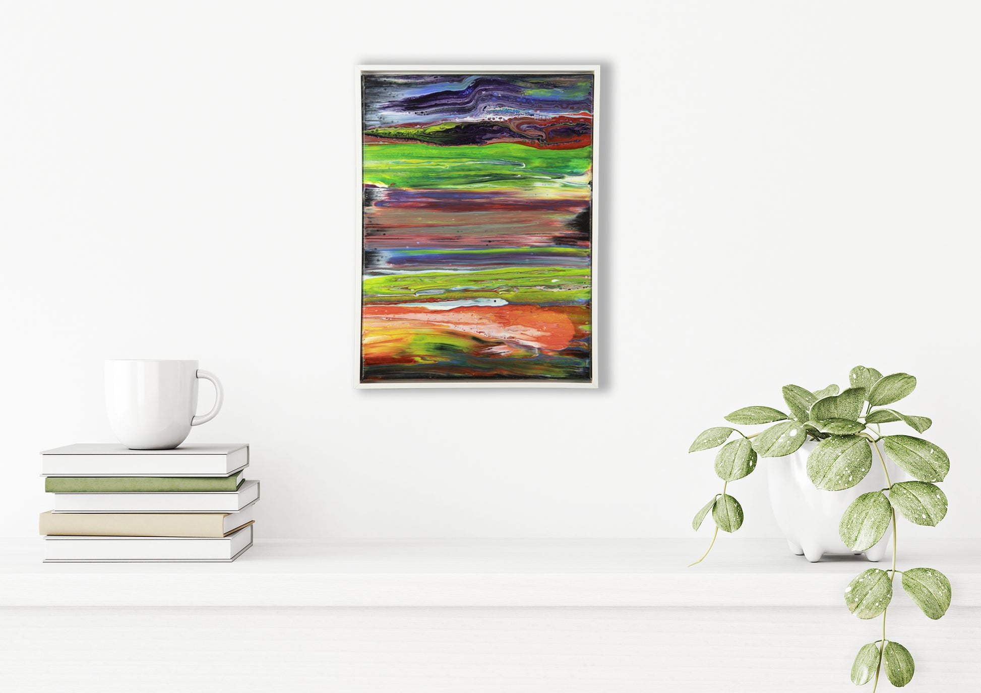 Rolling hills, bright vibrant sky. this abstract framed art piece will brighten any space.