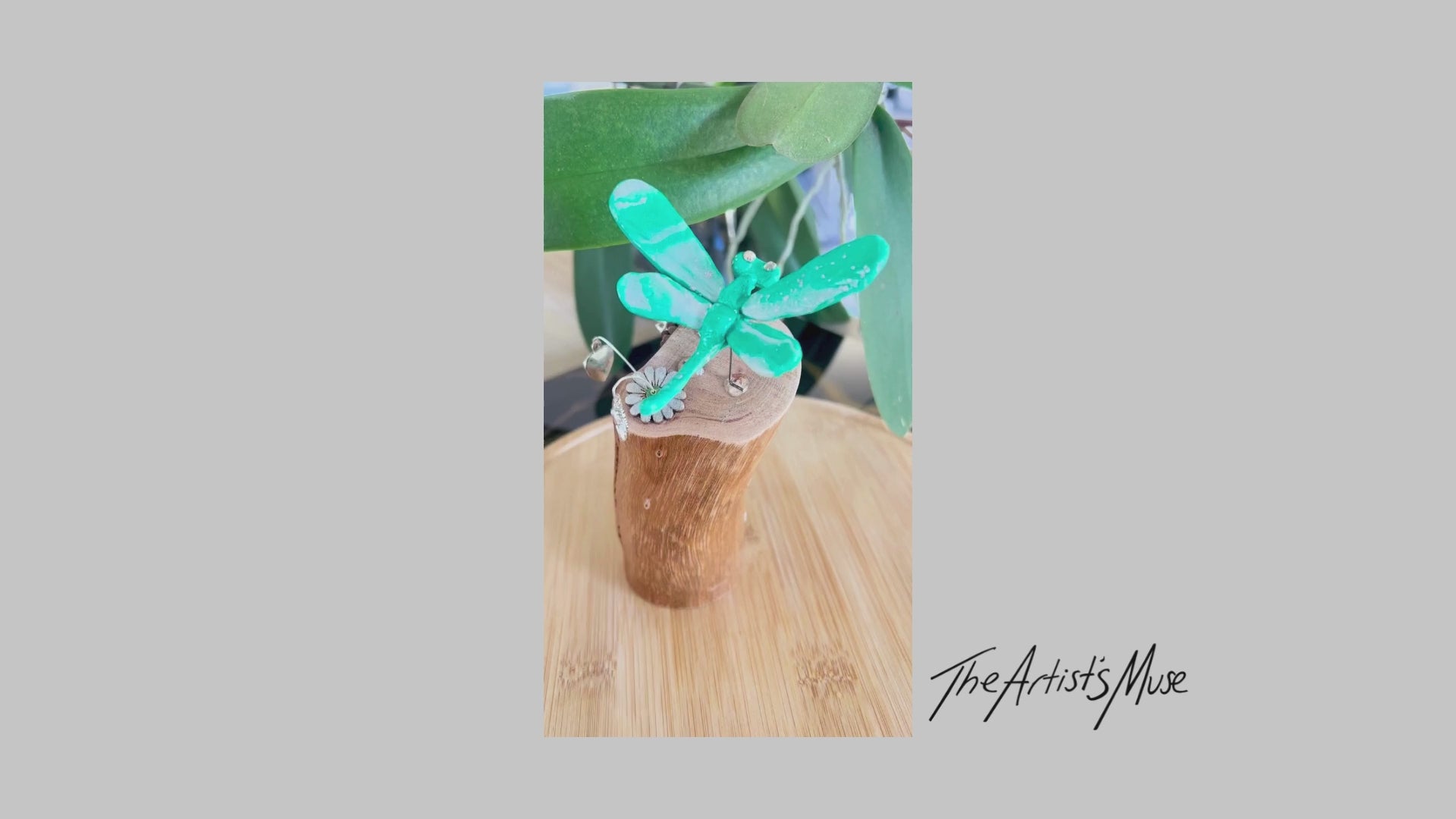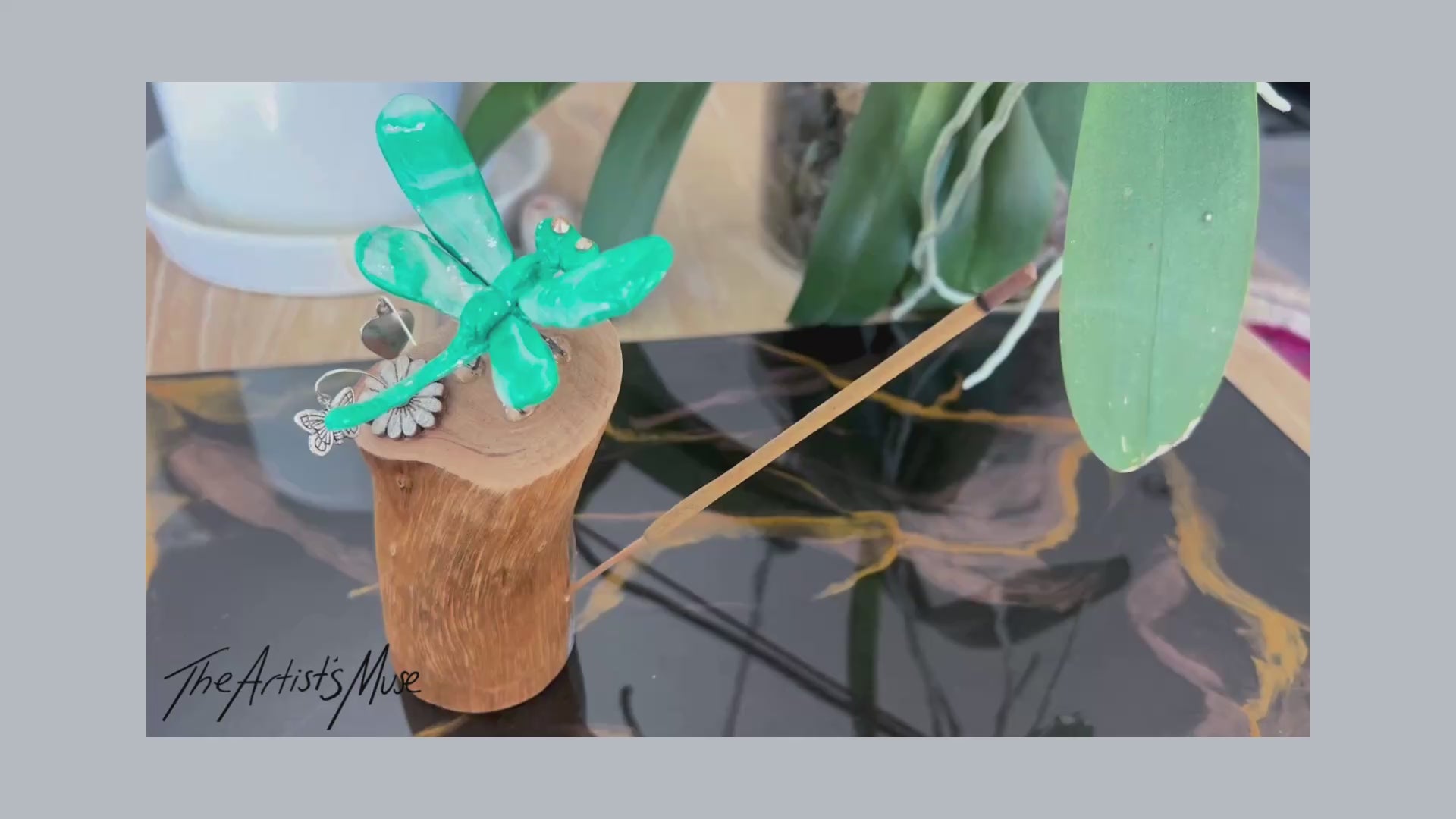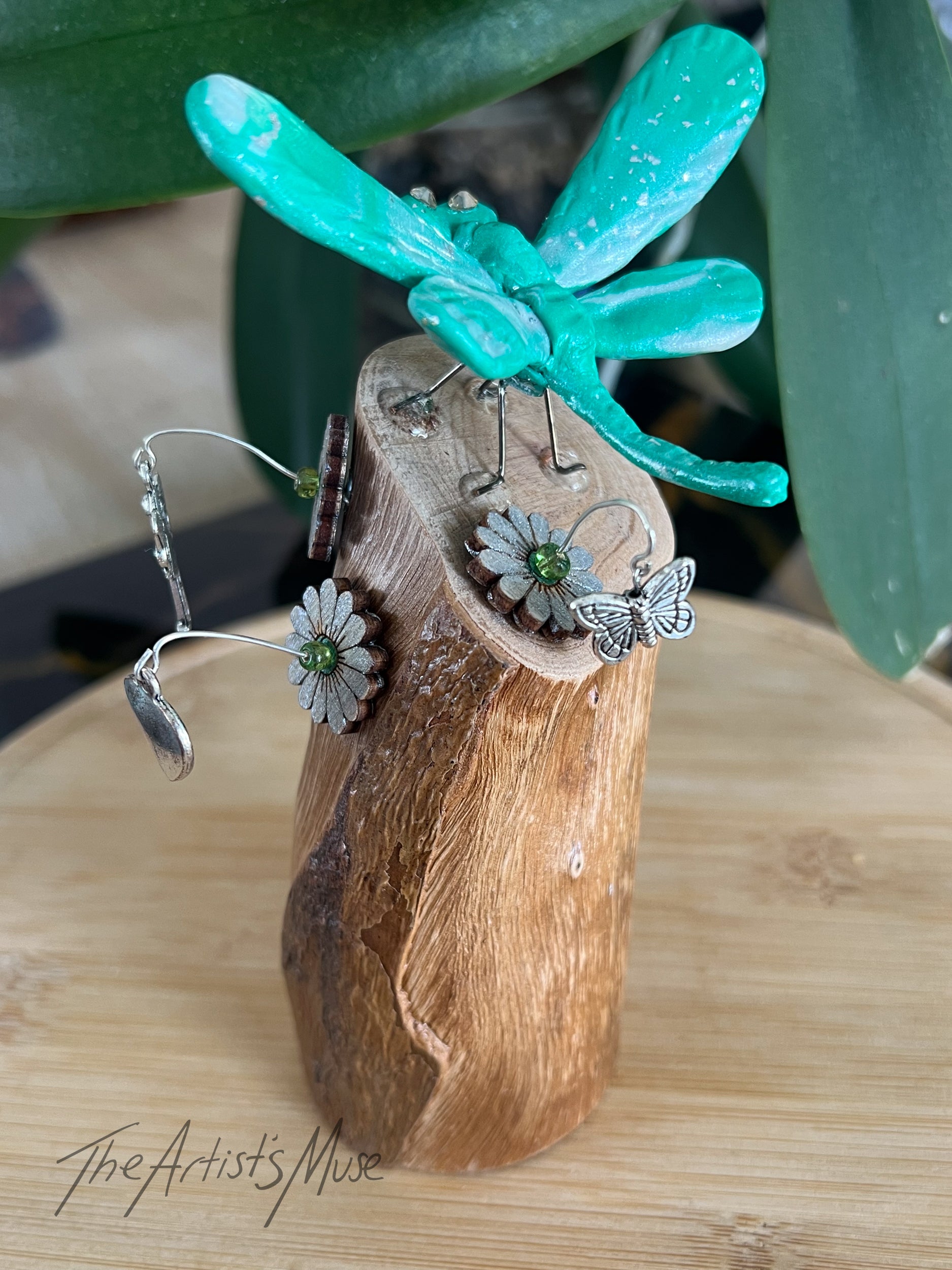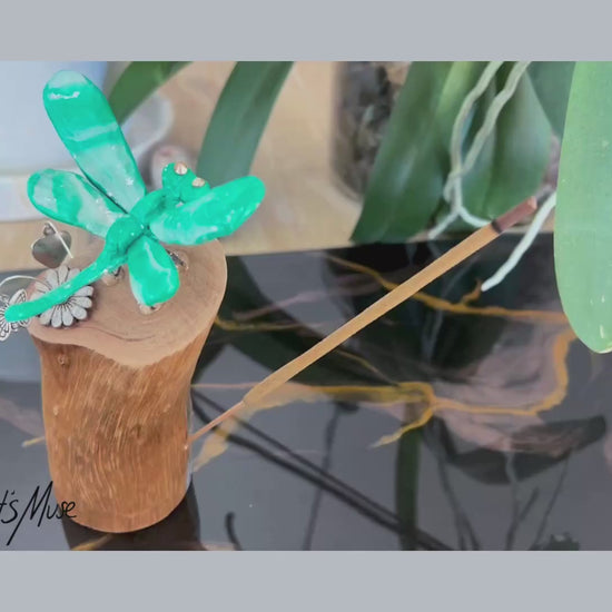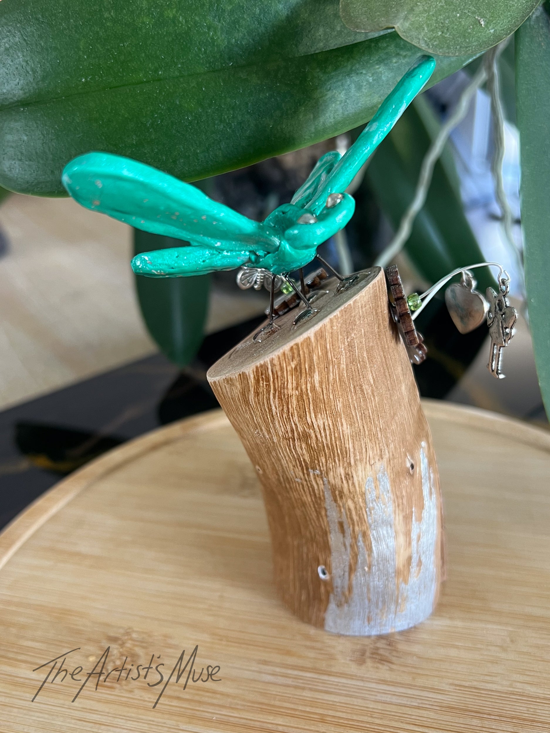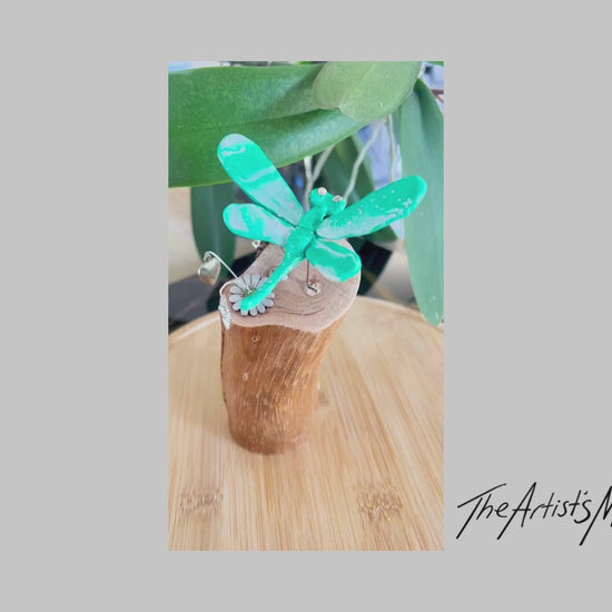 Hand made with timber and metal charm details. Ontop sits a gorgeous polymer clay handmade shimmery green dragonfly with little diamanté eyes.