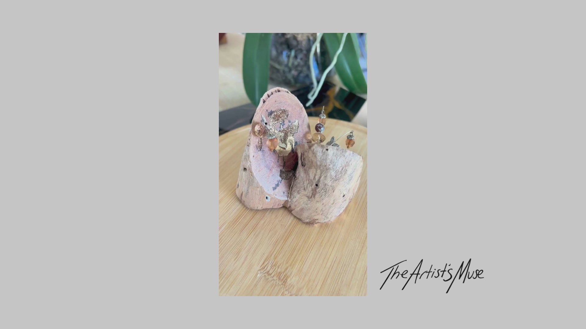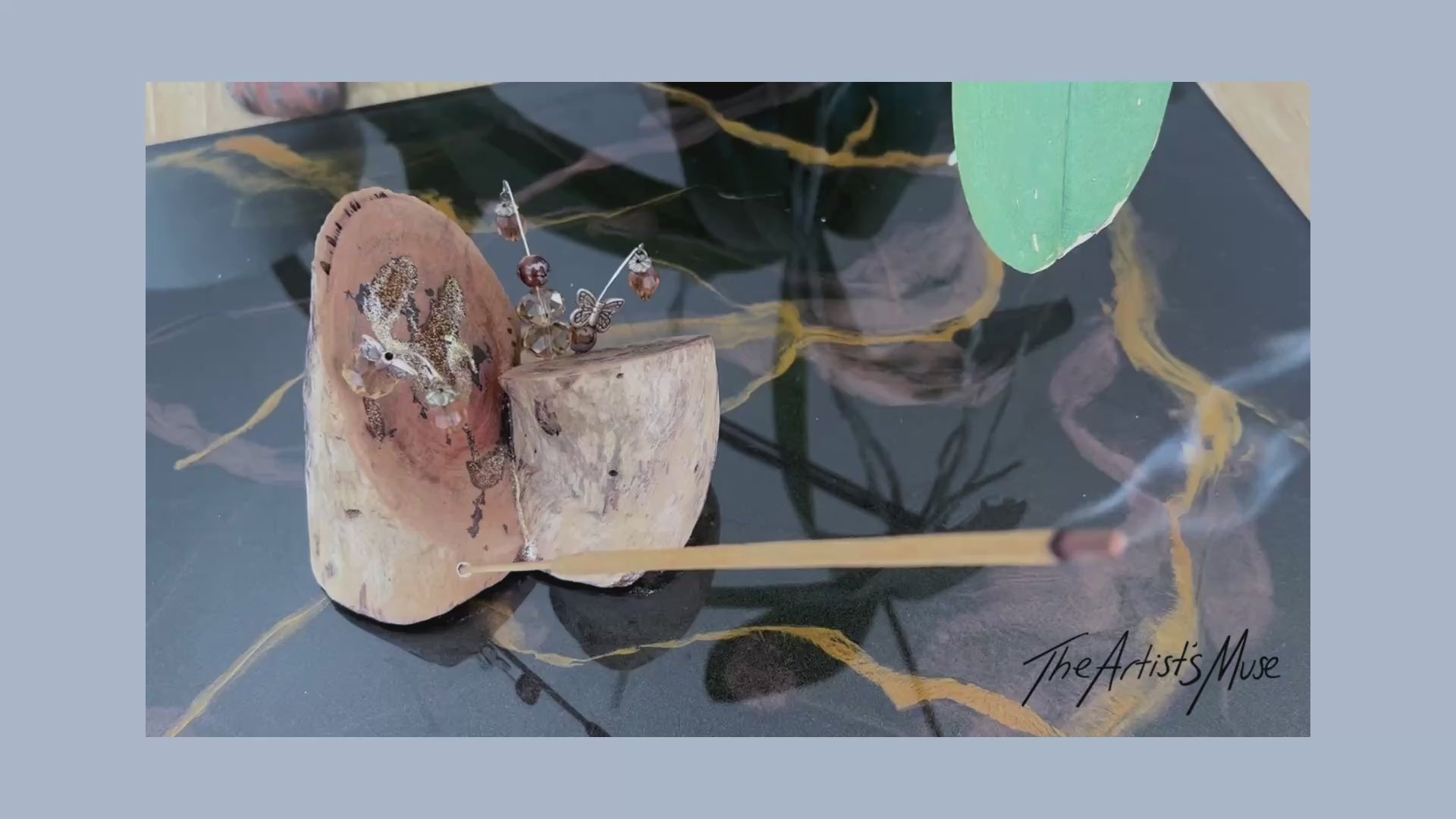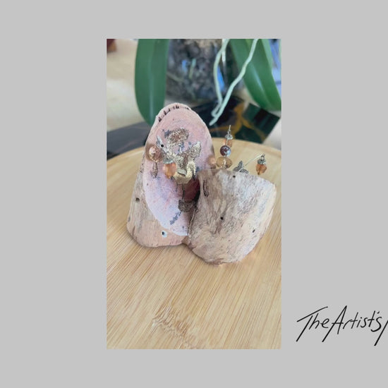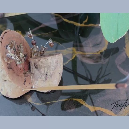 This gorgeous incense holder embraces the natural textures of the timber pieces, the centre filled with gold glitter resin, it feels like a magical little fairy home with hanging butterflies and antique beads.